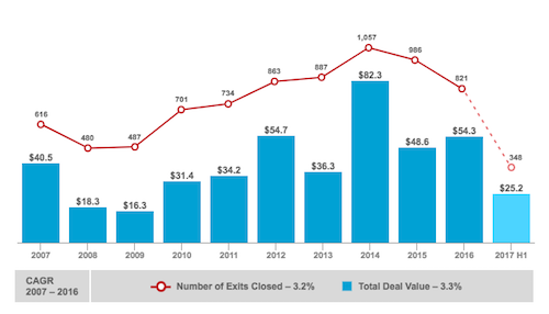 - Decline Since 2015 – Exit value reached peak $82.3 billion in 2014 out of 1,057 exits made, but declining since then to $48.6 billion in 2015 and $54.3 billion in 2016