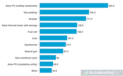 Wind and utility solar costs, averaging between at $45 and $49.5 per megawatt-hour, cheaper than fossil fuel coal and natural gas