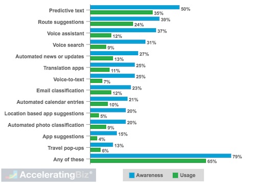 - Awareness and Usage – Overwhelming majority (79%) of respondents in Deloitte research aware and used at least one AI-enhanced application in smartphones in 2017