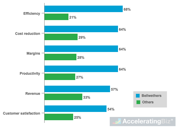 - Financial Gains – Six in ten of bellwethers also said they had greater than average cost reduction, higher margins and revenue, twice compared to non-bellwether organizations