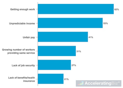 - Insufficient Work – Six in ten surveyed by Intuit chose not enough work (62%) as top challenge of on-demand economy workers, with 31% also highlighting growing number of workers providing same service and 27% mentioning lack of job security