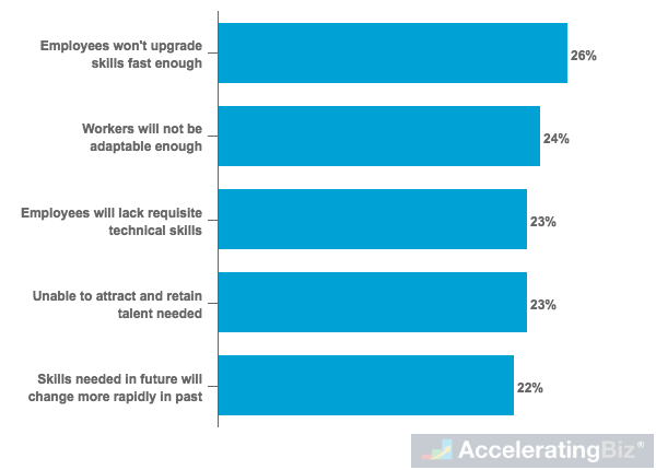 - Outdated Skills – Identified by companies surveyed by McKinsey Global Institute as top concern for reaping benefits of automation in the future, including employees being unable to upgrade skills fast enough (26%), not adaptable to changing work environment (24%) and lacking requisite technical skills (23%)