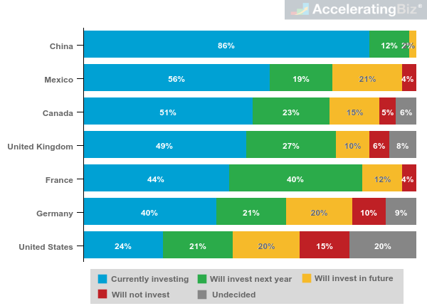 - Top Current Investors – More than half of companies in Mexico (56%) and Canada (51%) also hired staff experienced in blockchain in 2018, with approximately one-fifth more planning to do so in both countries by 2019