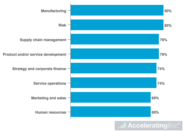 - Most Benefiting Functions – Manufacturing and risk tied as most mentioned business function where companies get moderate to significant benefits from implementing AI technologies in 2018