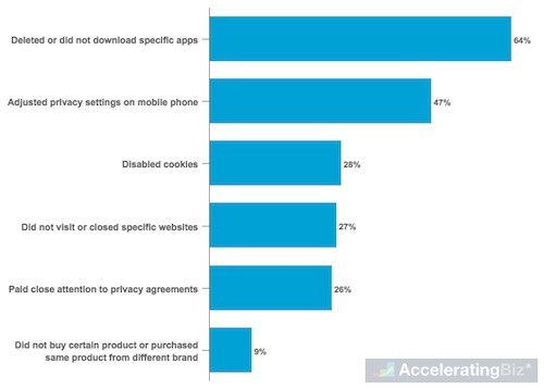 - Greater Scrutiny – 47% of U.S. consumers adjusted privacy settings on their mobile phone, 28% disabled cookies, and 26% paid closer attention to privacy agreements