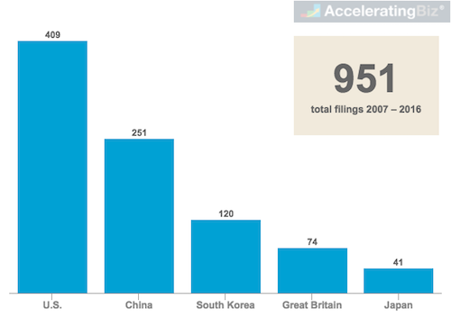 U.S. leads priority blockchain patent applications between 2007 and 2016, but Asian countries dominate top five list