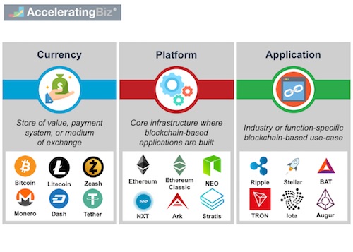 - Platform – Uses cryptocurrency to provide core infrastructure where blockchain-based applications are built (e.g. Ethereum, Ethereum Classic, NEO, NXT, Ark, and Stratis)