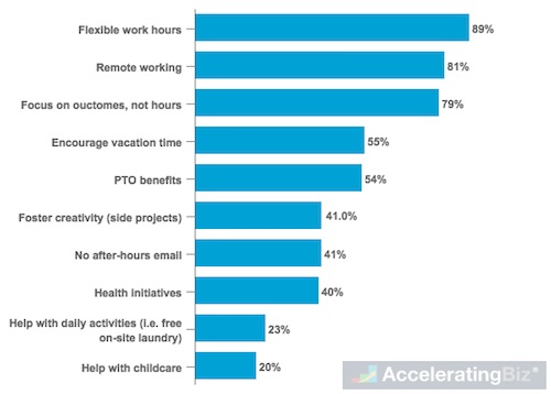 - More Vacation/Time Off – More than half (54% to 55%) want more vacation and paid-time off, with 41% preferring no e-mails after work hours