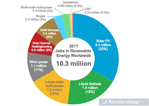 - Renewable Energy Jobs – Ren21 reported total jobs in renewable energy worldwide reached 10.3 million in 2017, with largest share coming from solar PV with 3.4 million (33%)