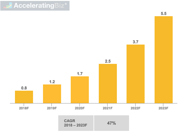 - Rising Consumer VR – Enterprise VR hardware and software revenues forecasted by Business Insider to increase 47% annually from $0.8 billion in 2018 to $5.5 billion in 2023