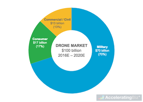 Global drone market value forecasted by Goldman Sachs to reach $100 billion for five-year period between 2016 and 2020, led by government sector