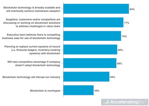 - Business Use – Three in four executives surveyed think blockchain can provide solutions to address value chain challenges as well as have compelling business use cases