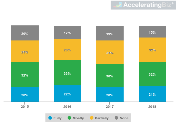 - Developing Diversity Policies – 64% of companies surveyed by Harvey Nash have partial to mostly formal strategy for promoting diversity in 2018, with little change since 2015