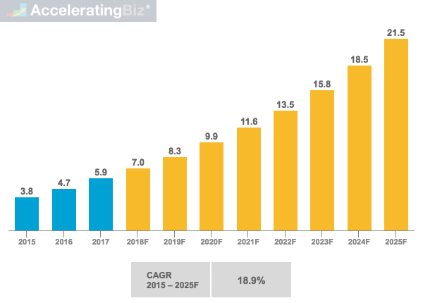 Global number of connected IoT devices forecasted by IoT Analytics to grow 19% annually between 2015 and 2025, from 3.8 billion to 21.5 billion