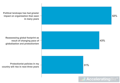 - Rise of Protectionism – Four in ten respondents reassessing their companies' global footprint as result of changing pace of globalization and protectionism, with 31% forecasting rise in protectionist policies in their own countries through 2020