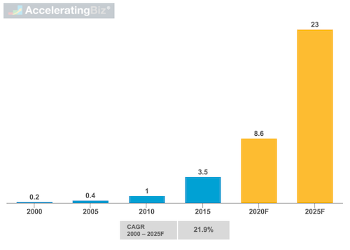 - Global Consumer Robotics – Forecasted by Boston Consulting Group (BCG) to grow 21.9% annually from $0.2 billion in 2000 to $23 billion in 2025