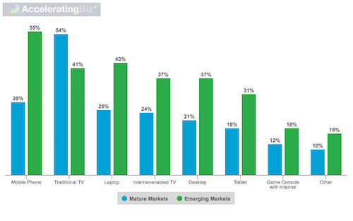Emerging markets more likely to watch videos via mobile phones, laptops, and other Internet-enabled devices, while mature markets are still more inclined to use traditional TVs