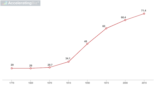 - Improved Life Expectancy – Global life expectancy improved significantly from 29 years in 1770 to 71 in 2015
