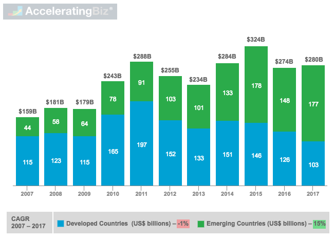 - Share in Global Investments – Shifted from mostly developed countries in 2007 to developing countries in 2017, driven by dramatic increase of investment in China, growing from $16.6 billion to $126.6 billion in past 11 years