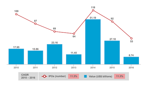 2016 slowest year for technology IPOs over past six years, with 50 offerings generating $8.74 billion