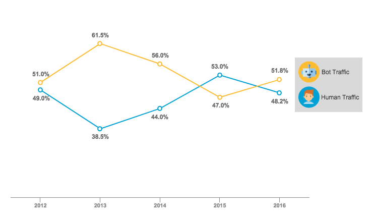 - Bot Traffic vs. Human Traffic – Bot traffic again surpassed human traffic in 2016, comprising more than half (51.8%) of online traffic, after experiencing three-year decline from highest 61.5% in 2013 to 47.0% in 2015