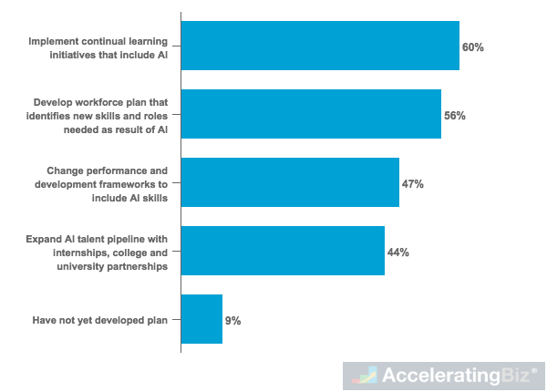 - Plans and Frameworks – 56% aims to develop workforce plan that will help identify new skills and roles needed, while 44% will include AI skills in performance and development frameworks