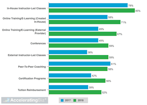 - Most Used Internal Resources – Employers more inclined to use internal resources, such as in-house classes (85%) and online training (71%), than external resources to train employees in 2018