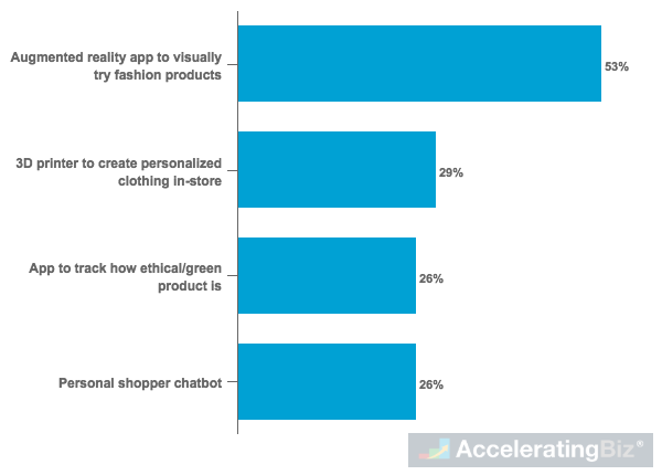 - Low Interest in Other Technology – Only one in four Millennials expressed interest in using other emerging technologies while fashion shopping, such as ability to create personalized 3D printed clothing in-store (29%), track how green certain products are using an app (26%), and access a personal shopper chatbot (26%)