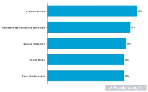 - Smart Shopping Carts – 35% also use AI for smart shopping carts, which help customers by autonomously driving to right aisle and shelf to retrieve items