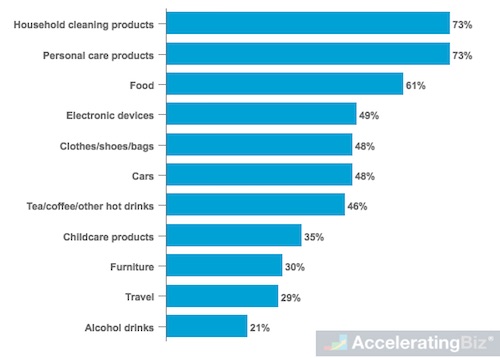 - Most Researched Products – Almost three in four respondents of GlobalWebIndex survey researched both household cleaning products and personal care products for chemicals that can be harmful to self and environment in 2018, followed by food (61%)