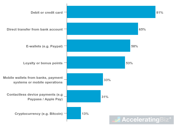 - Online Transfers and Wallets – Other top online payment methods used are bank account transfers (65%), e-wallets (58%) and mobile wallets (33%)