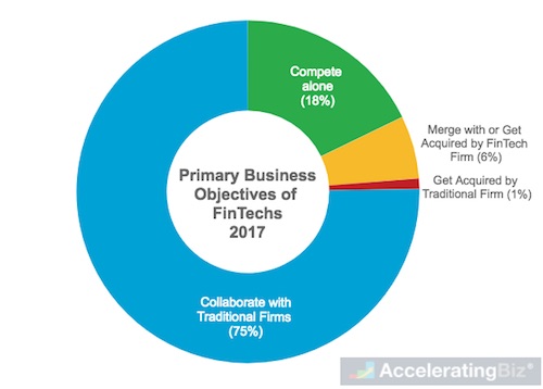 - Traditional Collaboration – Three in four respondents of World FinTech Report survey identified collaborating with traditional financial service firms as primary business objective in 2017