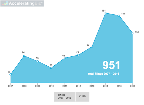 - Total Patent Applications – Prioritized patent applications between 2007 and 2016 totaled 951, growing from 23 in 2007 to 136 in 2016, an increase of 21.8% annually