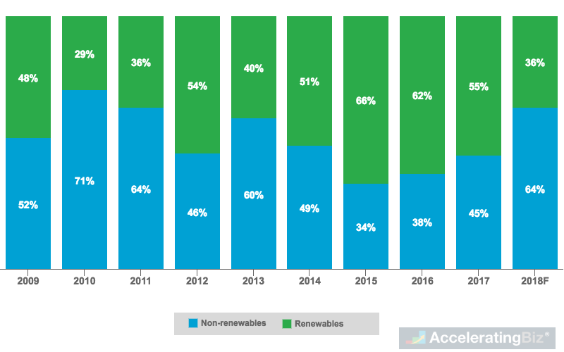 - Capacity Addition Share – EIA estimated renewable energy to make up 36% of new electricity capacity additions in 2018, first time for non-renewables to have majority share since 2013