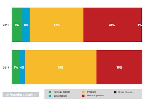 Data from app analytics company Flurry show phablets' share of active mobile devices rose from 41% in 2016 to 55% in 2017, while standard phones and tablets declined