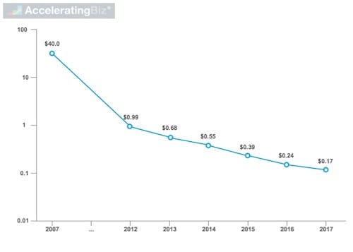 Cost of solid state drive storage dropped exponentially from $40/GB in 2007 to $0.17/GB in 2017