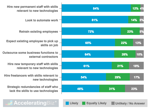- Internal Capability Development – 72% of respondents will focus on retraining already existing employees, while 65% expect current talent to pick up skills on job