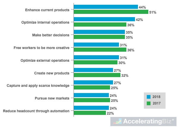 - Operations Optimization – More (42%) executives in 2018 cite optimization of internal processes as one of top benefits of artificial intelligence, compared to 36% in 2017, while three in ten still selected improvement of external operations as benefit of AI in 2018, almost same as 2017