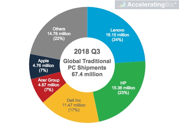 Global traditional PC shipments reached 67.4 million in 2018 Q3, led by Lenovo and HP, according to IDC