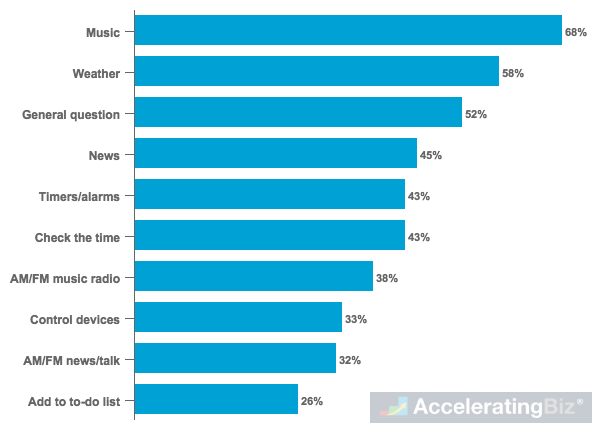 - Listening to Music – More than two-thirds of smart speaker owners surveyed by NPR and Edison Research say they use device regularly to listen to music, with 38% also using device to listen to radio