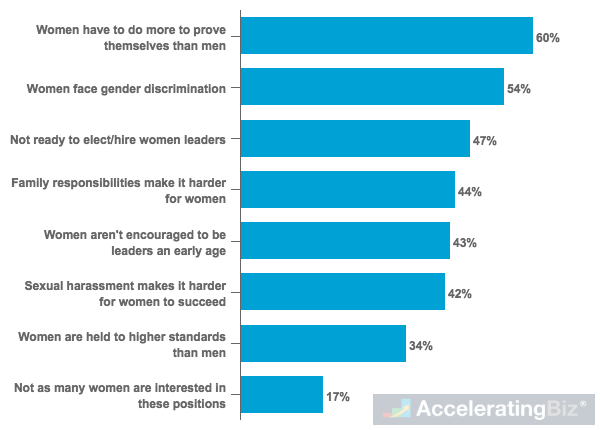 - Uninterested Women – 17% of adults surveyed said there is a lack of women leaders because there not as many who are interested in those positions