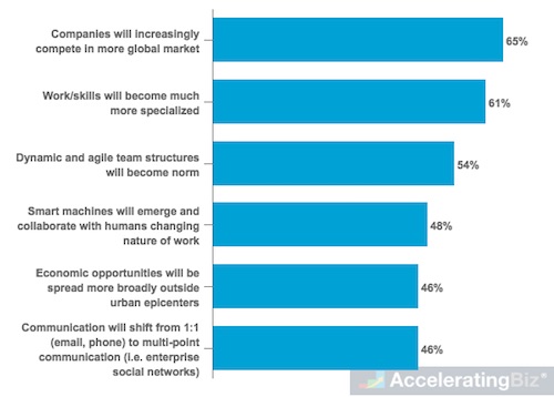 - Skilled, Agile Teams – More than half of respondents believe that office work and skills will become more specialized (61%) and that dynamic team and structures will become norm (51%)