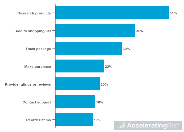 - Listing and Tracking – Around one-third of participants used voice assistants to add in their shopping list (36%) and track package (30%)