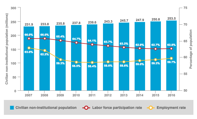 U.S. employment by gender returned to pre-2009 financial crisis level in 2016, with women and men employed at comparable levels