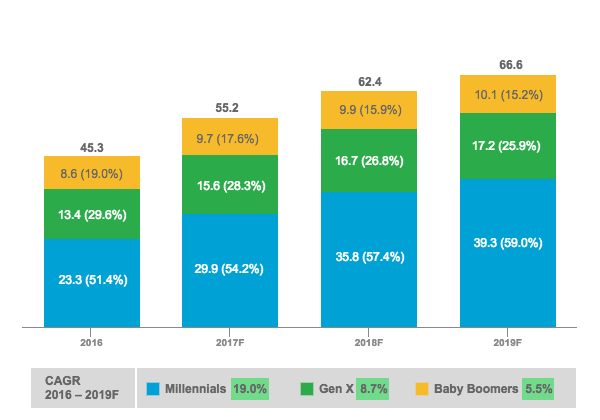 - Significant Millennial Adoption Growth – Millennial user growth projected to be fastest among three generations, increasing 19.0% annually from 23.3 million (51.4%) in 2016 to 39.3 million (59.0%) in 2019