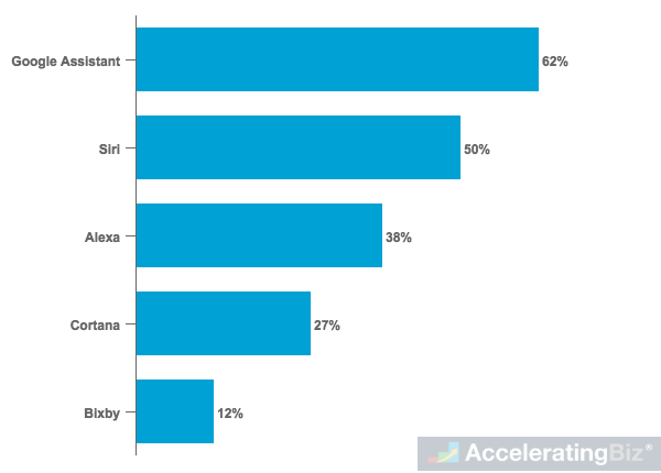 - Top Smartphone Assistants – 62% of GlobalWebIndex survey respondents used Google Assistant on their smartphones as of August 2018, followed by Apple's Siri (50%)